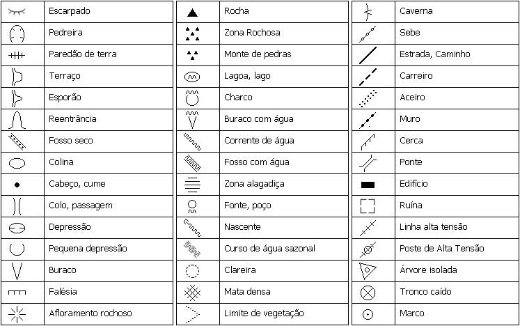 - PRETO é a cor mais utilizada e representa variados objectos e características do terreno, geralmente artificiais ou rochosos: estradas, caminhos, linhas de alta-tensão, edifícios, rochas e falésias.