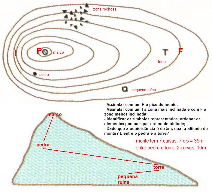 - Dado que a equidistância é de 5m, qual a altitude do monte? E entre o pedra e a torre?