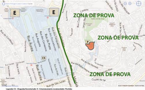 CONDICIONAMENTOS DE CIRCULAÇÃO - Dentro do Castelo só será possível circular, antes da partida, na Praça de Armas (zona assinalada a vermelho no mapa em anexo). Na restante área de prova só será permitida a circulação dentro da área azul na imagem em anexo. Estacionamentos serão autorizados em toda a zona azul recomendando os estacionamentos cobertos (pagos) do Martim Moniz e dos Restauradores (evitando o caminho para o Castelo). O caminho para o Castelo só é autorizado pela via que estará balizada saindo da Rua Augusta para sul, seguindo pela Rua da Conceição, passando junto à Igreja da Madalena e subindo pela Escada de São Crispim até ao Chapitô;