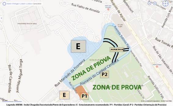 CONDICIONAMENTOS DE CIRCULAÇÃO - Poderá haver desclassificação se os atletas de competição circularem dentro das zonas de prova (verdes) antes da sua hora de partida. Circulação nas zonas azuis são autorizadas antes e durante a prova. O acesso à Arena deverá ser efectuado por um dos corredores assinalados e marcados no local. Não deve haver outro tipo de atravessamentos do Jardim Amália Rodrigues antes da partida.