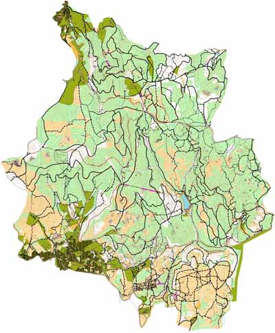 O terreno é um misto de floresta e áreas abertas. O mapa possui zonas com algum desnível e algumas subidas mais acentuadas e descidas mais técnicas.