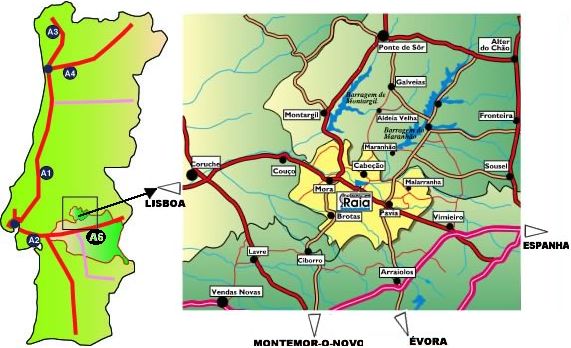 - Exit highway A2 to highway A6 (direction Espanha/Évora/Vendas Novas), for 44Km, and then use exit 4 to leave A6 in direction to Montemor-o-Novo/Arraiolos;